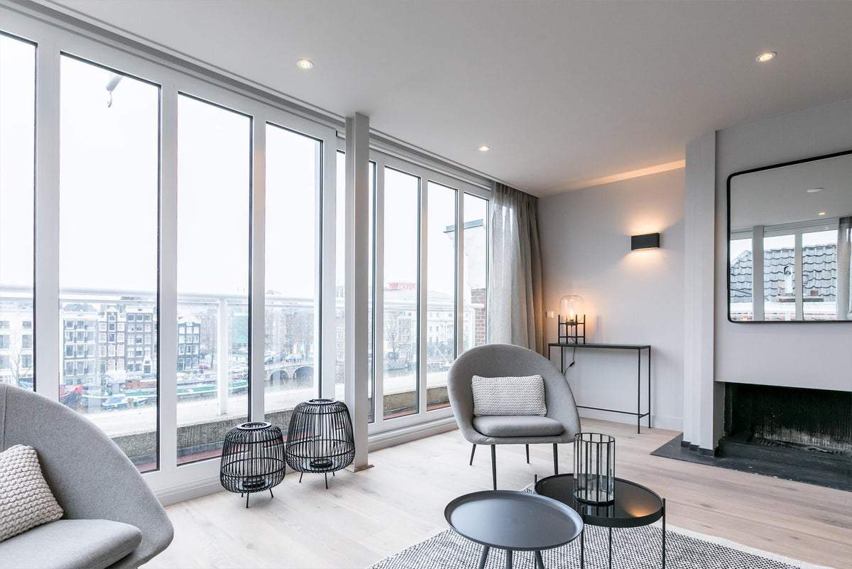 Dieses luxuriöse Penthouse am Amstelfluss bietet ein einzigartiges Wohnerlebnis im Herzen von Amsterdam. Mit einer Fläche von 160 m² verfügt diese Wohnung über zwei geräumige Schlafzimmer, die mit natürlichem Licht durchflutet sind und mit Einbauschränken ausgestattet sind, sowie über zwei moderne Bäder mit hochwertigen Ausstattungen. Die Immobilie umfasst zwei Balkone, die ruhige Ausblicke auf den Kanal und die Stadt bieten, sowie eine großzügige private Dachterrasse, die ideal für die Unterhaltung von Gästen ist.