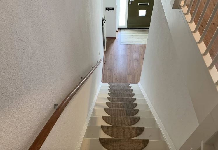 Der erste Stock verfügt über zwei geräumige Schlafzimmer, eines davon mit einem Dachfenster und das andere mit einer Nische für einen Kleiderschrank. Das moderne Badezimmer ist komplett gefliest und verfügt über eine Duschkabine, ein Waschbecken, eine Badewanne, einen Heizkörper und eine zweite Hängetoilette. Der gesamte erste Stock ist mit Laminat ausgelegt.