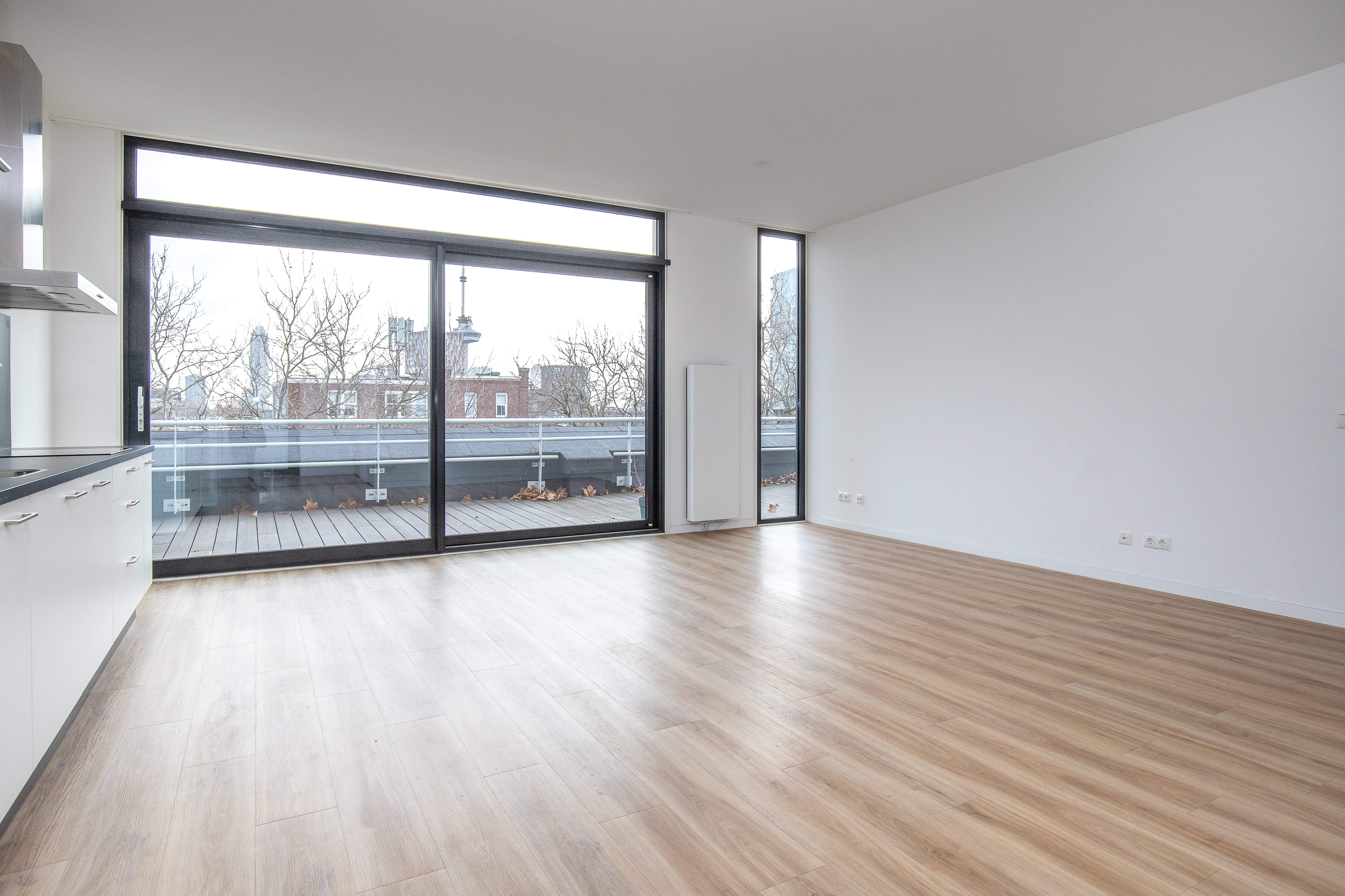 Diese wunderschöne Penthouse-Wohnung befindet sich in The Cohesion WEST507 im Stadtteil Delfshaven in Rotterdam. Das Penthouse Typ P1 verfügt über zwei Schlafzimmer, ein geräumiges Wohnzimmer und ein Badezimmer mit ebenerdiger Dusche. Die Küche ist gut ausgestattet mit einer Kombi-Mikrowelle/Ofen, einem Kühl-Gefrierkombination, einem Geschirrspüler und einem Induktionskochfeld. Die Wohnung verfügt außerdem über einen separaten Raum mit Waschmaschinenanschluss und eine große Terrasse mit Blick auf die Stadt.