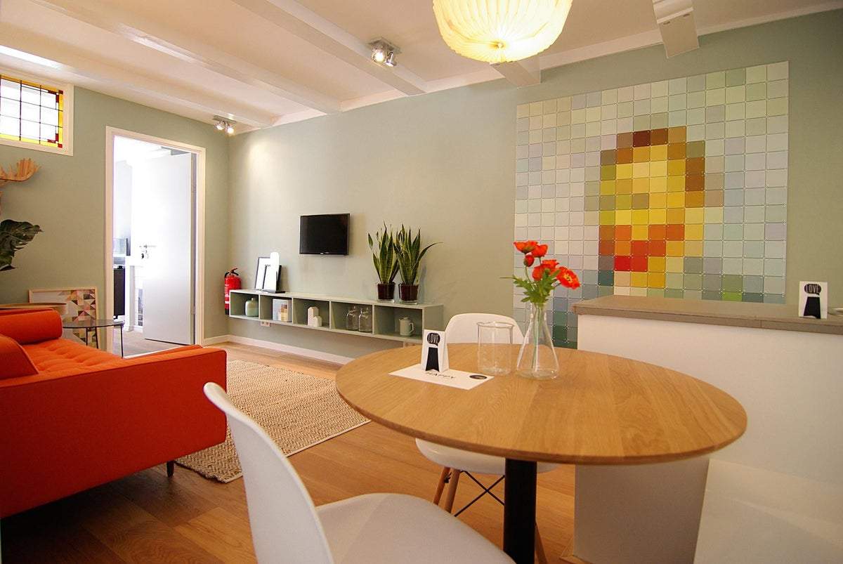 El piso forma parte de un edificio existente construido en 1783 y se accede a él a través de una entrada comunitaria y una puerta de entrada privada en el segundo piso. El interior está bien mantenido y amueblado, con lavadora y secadora disponibles en la misma planta. La cocina está equipada con electrodomésticos modernos integrados, lo que aumenta la comodidad del espacio.
