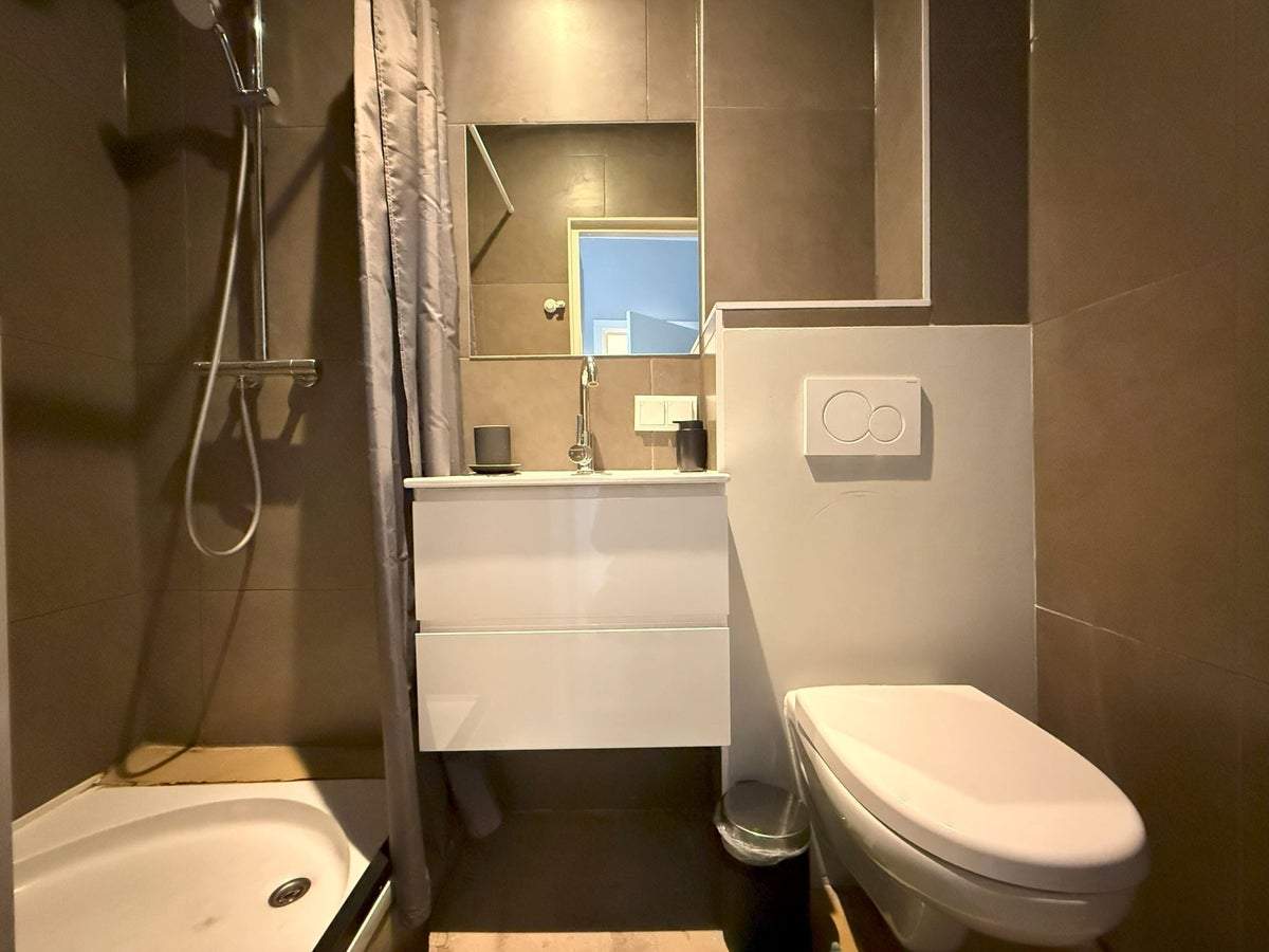 El apartamento cuenta con un estudio luminoso y espacioso con grandes ventanales, una cocina abierta nueva equipada con electrodomésticos modernos y un moderno baño totalmente alicatado con ducha de lluvia a ras de suelo. La superficie habitable total es de aproximadamente 25 m², lo que lo hace adecuado para un máximo de una persona. El edificio tiene una entrada comunitaria a nivel de calle, con la puerta de entrada privada ubicada en el primer piso.