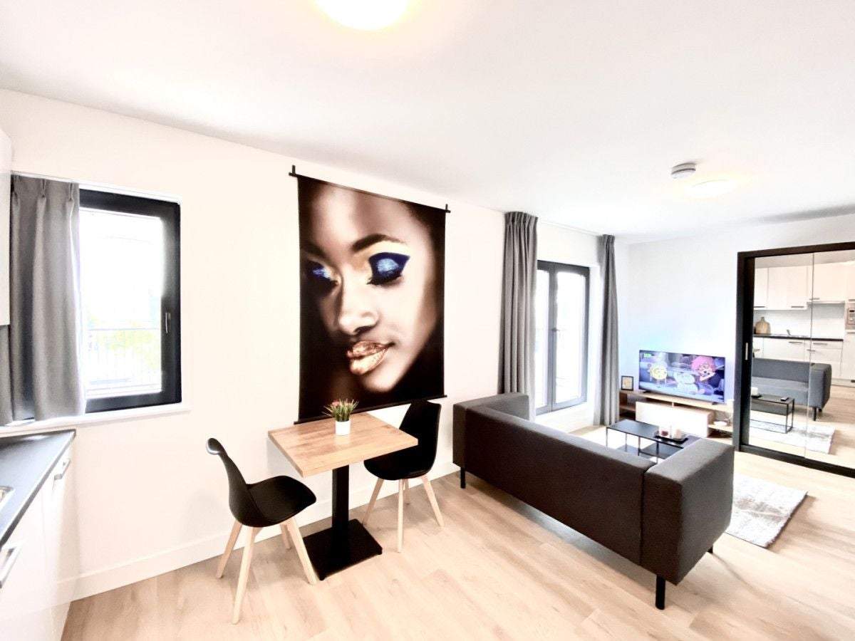 Este estudio viene completamente amueblado, incluyendo una moderna cocina abierta equipada con una placa de cocción eléctrica, lavavajillas, refrigerador con un compartimento de congelación, y un microondas combinado. La sala de estar incluye un sofá, una mesa de comedor/trabajo, y muebles de TV con un televisor inteligente. El baño está equipado con un inodoro, lavabo, y cabina de ducha, mientras que el dormitorio cuenta con una cama de dos personas (140×200) y amplio espacio de almacenamiento con un armario, iluminación, y cortinas. El suelo de PVC laminado continuo está equipado con calefacción para mayor comodidad.