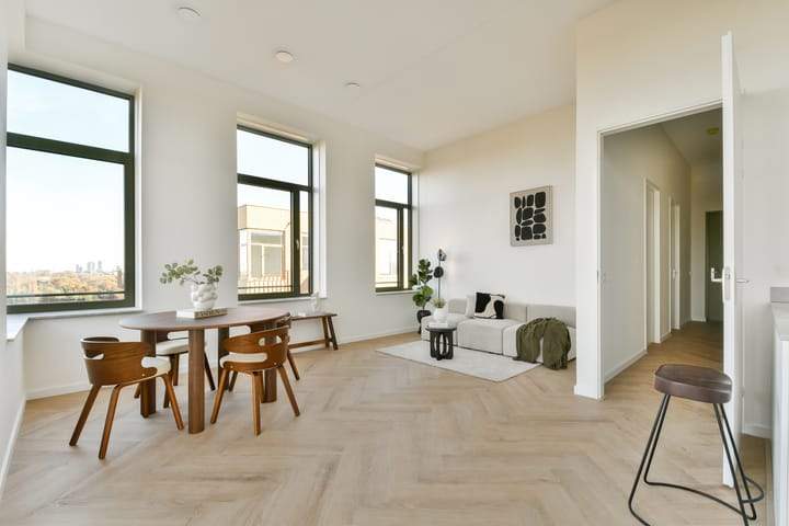 Ce penthouse moderne est situé à Westerpark West, Amsterdam. La propriété dispose d'un salon spacieux de 65 mètres carrés avec deux chambres et offre une vue panoramique sur le parc ou la ville. L'intérieur comprend un salon lumineux avec une cuisine ouverte moderne, une salle de bain aménagée avec une douche à l'italienne et des toilettes séparées. Le penthouse est situé au dernier étage avec une hauteur sous plafond d'environ 3,20 mètres, créant une atmosphère ouverte et aérée. La propriété fait partie d'un complexe qui allie confort et durabilité, doté d'un système de stockage d'énergie thermique pour le chauffage et la climatisation.