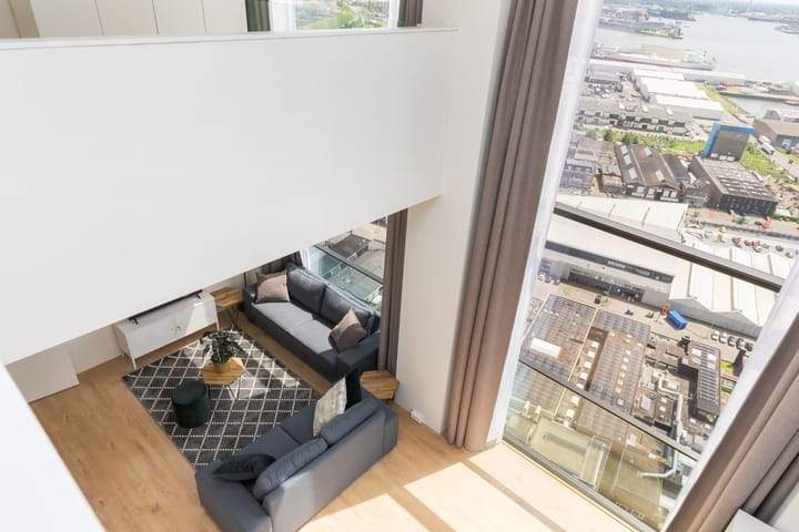 The Lee Towers à Rotterdam propose un luxueux appartement penthouse à louer. Situé à Galvanistraat 195, 3052 AD Rotterdam, ce penthouse dispose d'un agencement spacieux avec 3 pièces, dont 2 chambres, et une surface habitable totale de 106 m². L'appartement comprend une cuisine blanche entièrement équipée, une salle de bain avec douche à effet pluie et un chauffage au sol pour plus de confort. Le design moderne du bâtiment allie des caractéristiques classiques à une ambiance luxueuse, offrant une vue imprenable sur la ligne d'horizon de la ville.