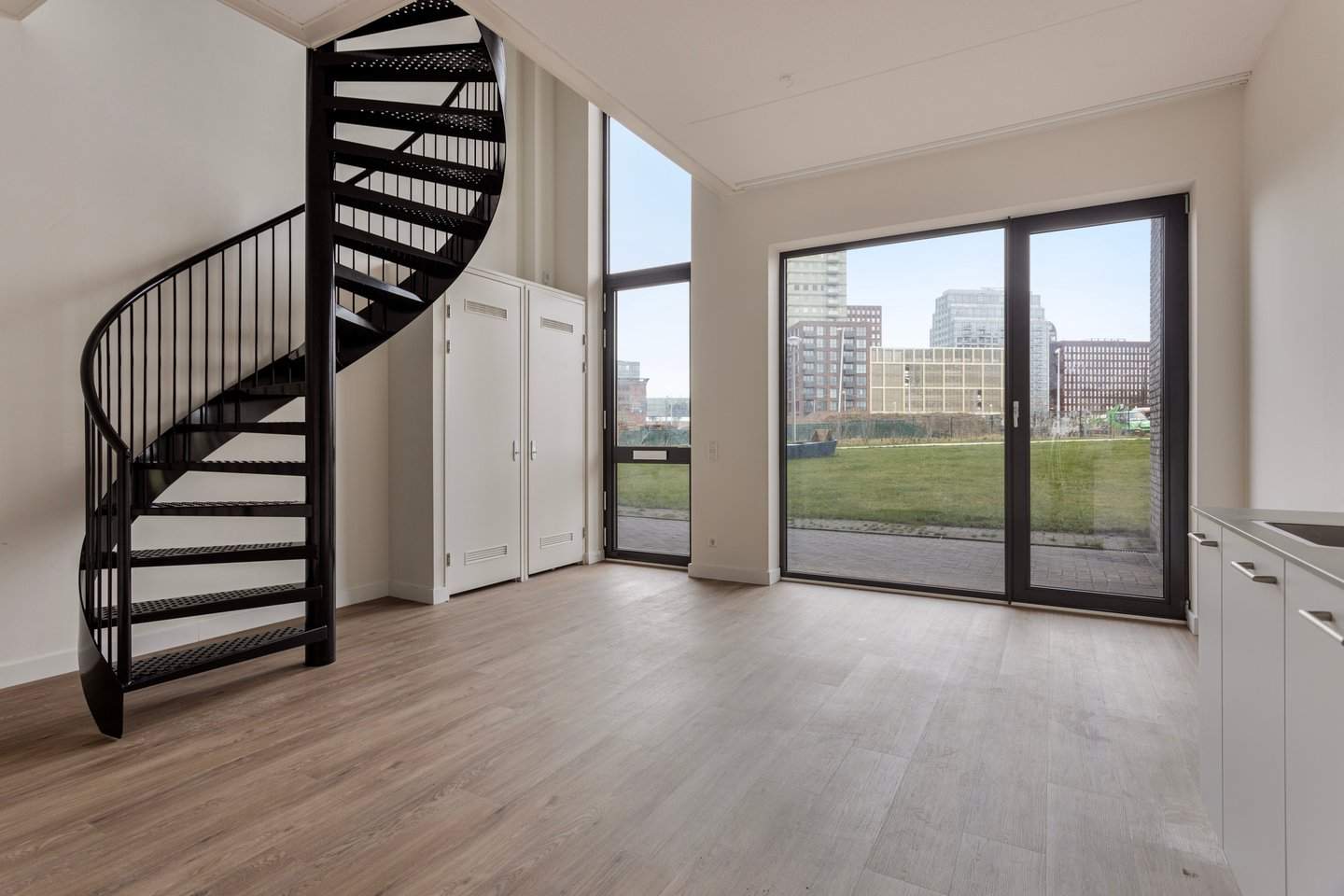 Het appartement heeft een speelse indeling verspreid over twee niveaus, met grote ramen die voor veel natuurlijk licht zorgen in de ruimte. Bij binnenkomst word je verwelkomd in een ruime woon- en eetkamer met een loft en een goed uitgeruste open keuken met alle benodigde inbouwapparatuur. Vanuit de woonkamer heb je toegang tot een gang die leidt naar een toilet en opslagruimte, wat de functionaliteit van de woning vergroot.