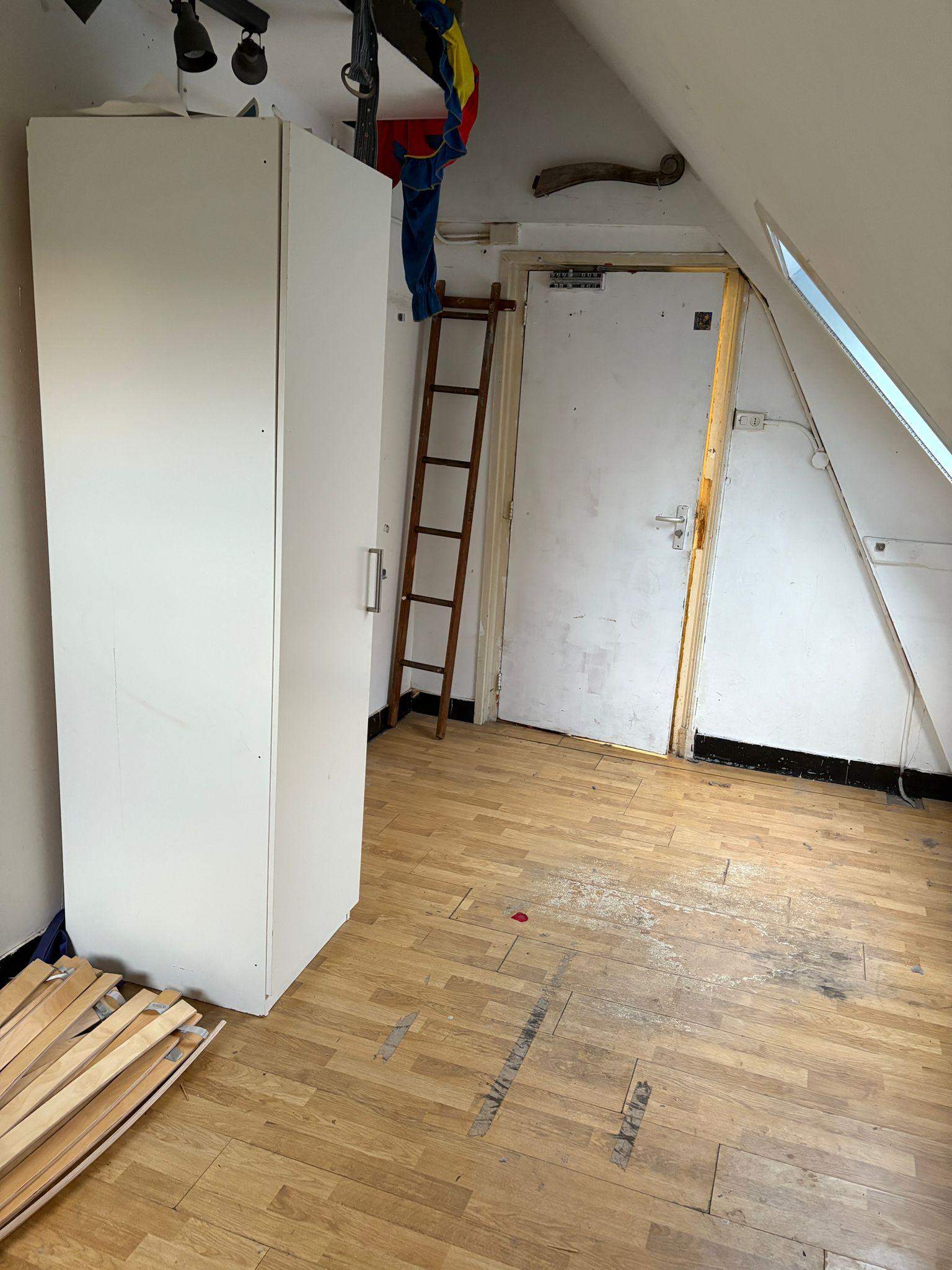 Deze gestoffeerde kamer is te huur aan de Spoorsingel 66 in Delft. De kamer bevindt zich op de 3e verdieping en meet 12 vierkante meter. Het heeft een schuin dak met een raam en is voorzien van werkende gordijnen, lampen en stopcontacten. Er staat momenteel een kledingkast in de kamer en er is een bedframe van 180x200 beschikbaar indien nodig.