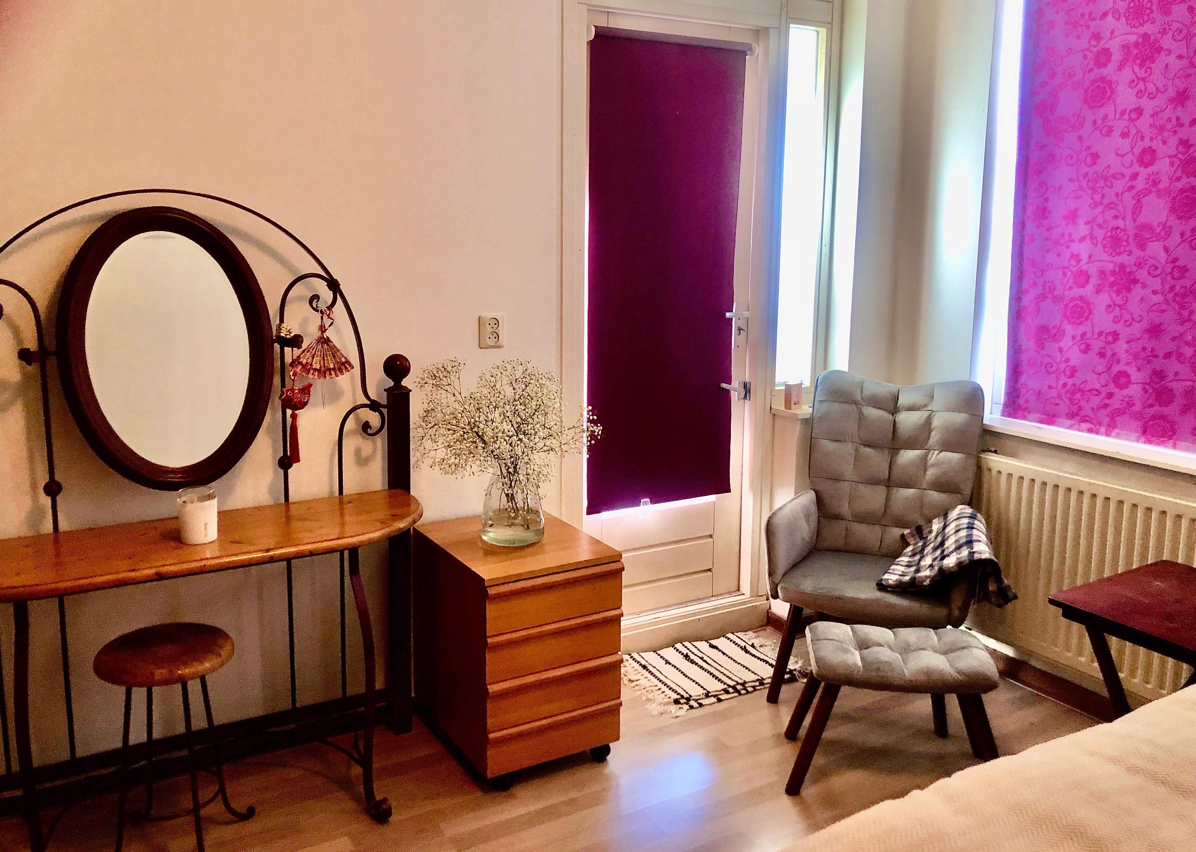 A furnished room is available for rent on Avercampstraat in Amsterdam. The room is fully furnished and equipped with a large wardrobe, a large bed, a makeup table, an armchair, and a pouffe. It has access to a balcony and features a separate bathroom and toilet. The kitchen is shared and accessible via the balcony.