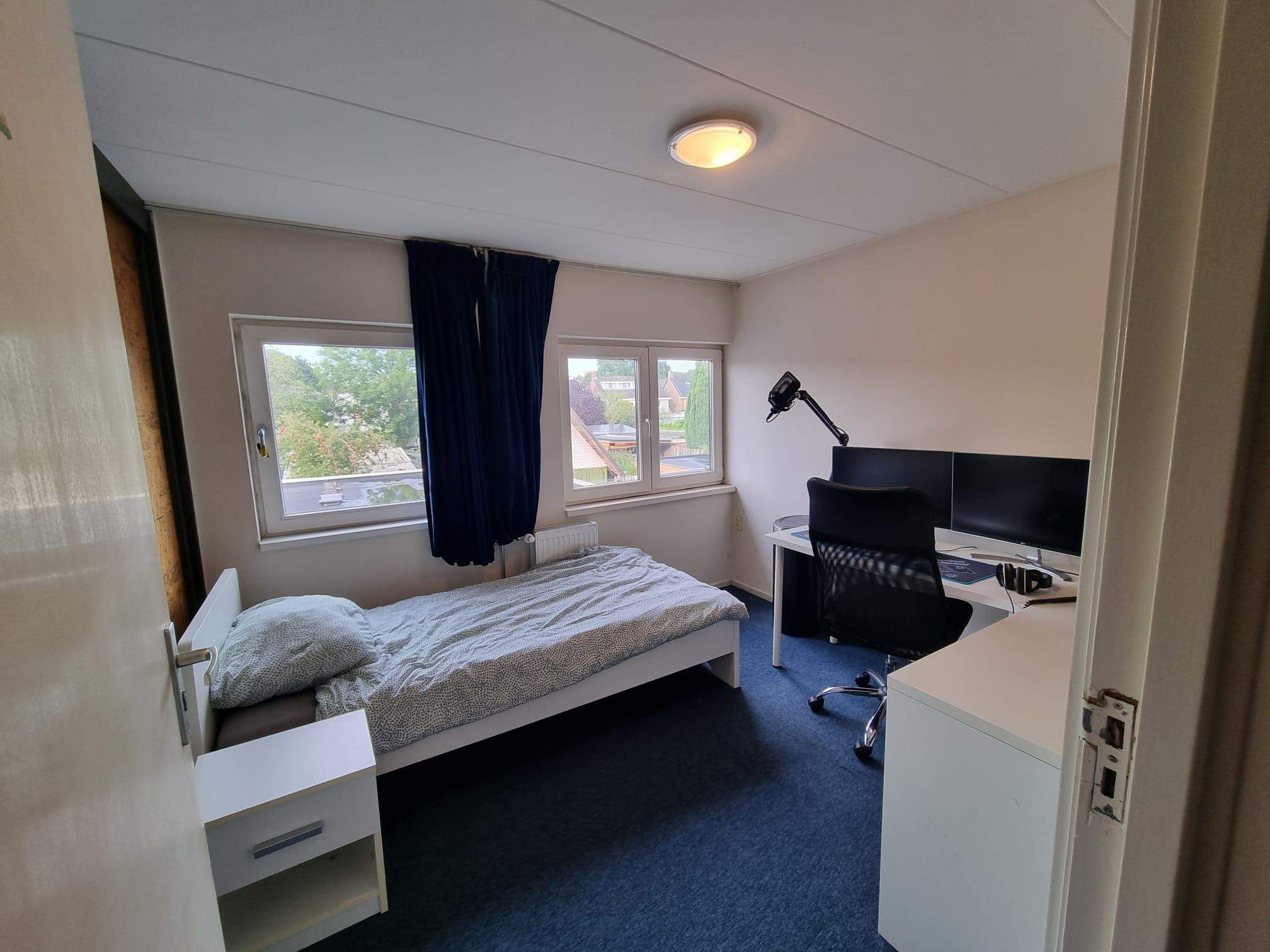 This furnished room is part of a shared student rental house located in Enschede, close to the University of Twente and the city centre. The house is fully furnished and includes a living room, kitchen, laundry room, downstairs toilet, upstairs bathroom, and a garden with a locked gate for bicycle parking. The room itself is also furnished, excluding the PC setup and second desk shown in the pictures. The rent includes gas, water, and internet.