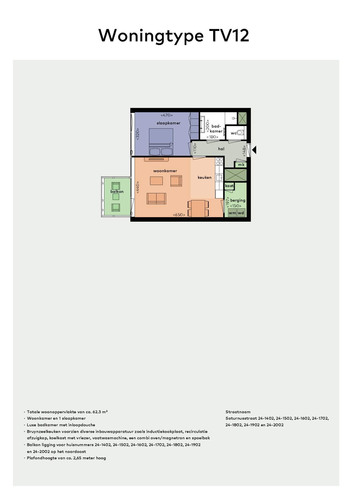 The apartment has one spacious bedroom that is well-insulated for a good night's sleep. The bathroom is equipped with a walk-in shower and a washbasin with mirror and design radiator. The apartment also has a separate toilet, a meter cupboard, and a storage room for the washing machine, dryer, and other installations such as ventilation and floor heating controls. The apartment is finished to a high standard and has a sleek wallpaper. The heating is provided by floor heating, which creates a pleasant indoor climate. The balcony is a lovely spot to relax and enjoy the sun.